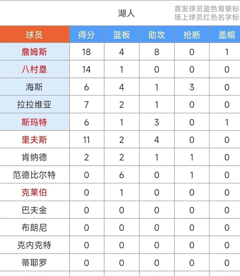 除了詹姆斯之外,八村塁13投9中,其中三分球4投3中,贡献了21分和3个篮板,他在第三节的连续得分是球队拉开分差的关键。奥斯汀·里夫斯替补出场28分钟,10投5中,罚球9罚7中,得到18分、4个篮板和6次助攻的全面数据。贾克森·海斯表现极其高效,10投8中,拿下16分、7个篮板、4次助攻以及3次抢断和1次盖帽,他的正负值 26为全场最高。杰克·拉拉维亚也有11分入账。