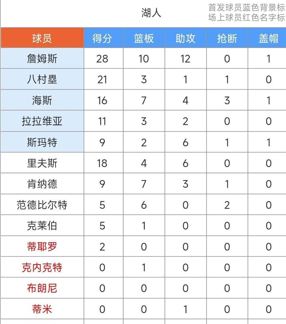 纵观全场数据,湖人队可谓多点开花,五人得分上双。勒布朗·詹姆斯出战35分21秒,20投10中,三分球7投2中,罚球7罚6中,高效砍下28分,并摘下10个篮板,送出12次助攻,另外还有1次盖帽进账。这是他个人本赛季的第一次三双,也是他职业生涯总计第123次三双,在NBA历史三双榜上位列第五。同时,这也是他身披湖人战袍取得的第50次三双,在湖人队史上仅次于“魔术师”埃尔文·约翰逊的138次,排名第二。