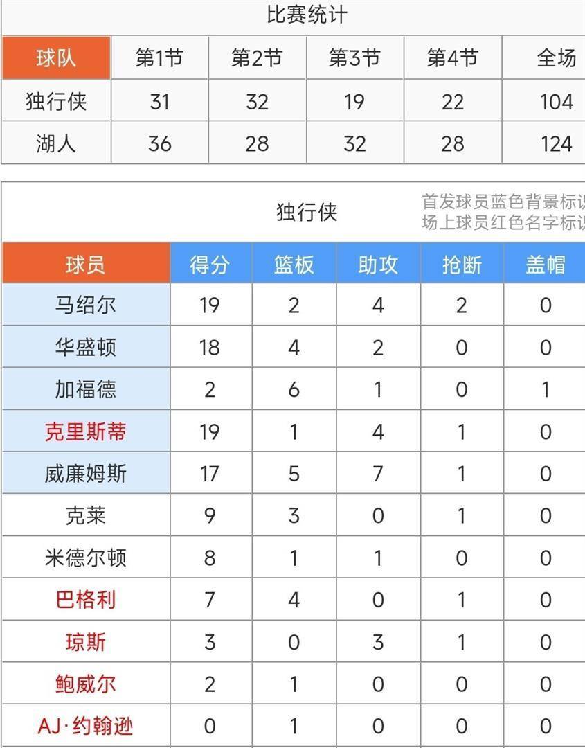 独行侠方面,尽管输球,但几名年轻球员的表现可圈可点。纳吉·马绍尔得到全队最高的19分,外加2个篮板和4次助攻。马克斯·克里斯蒂面对旧主湖人同样砍下19分,并送出4次助攻。PJ·华盛顿贡献18分和4个篮板,布兰登·威廉姆斯则有17分、5个篮板和7次助攻的全面表现。然而,核心球员的缺失让他们在整体实力和关键时刻的稳定性上,与湖人存在明显差距。