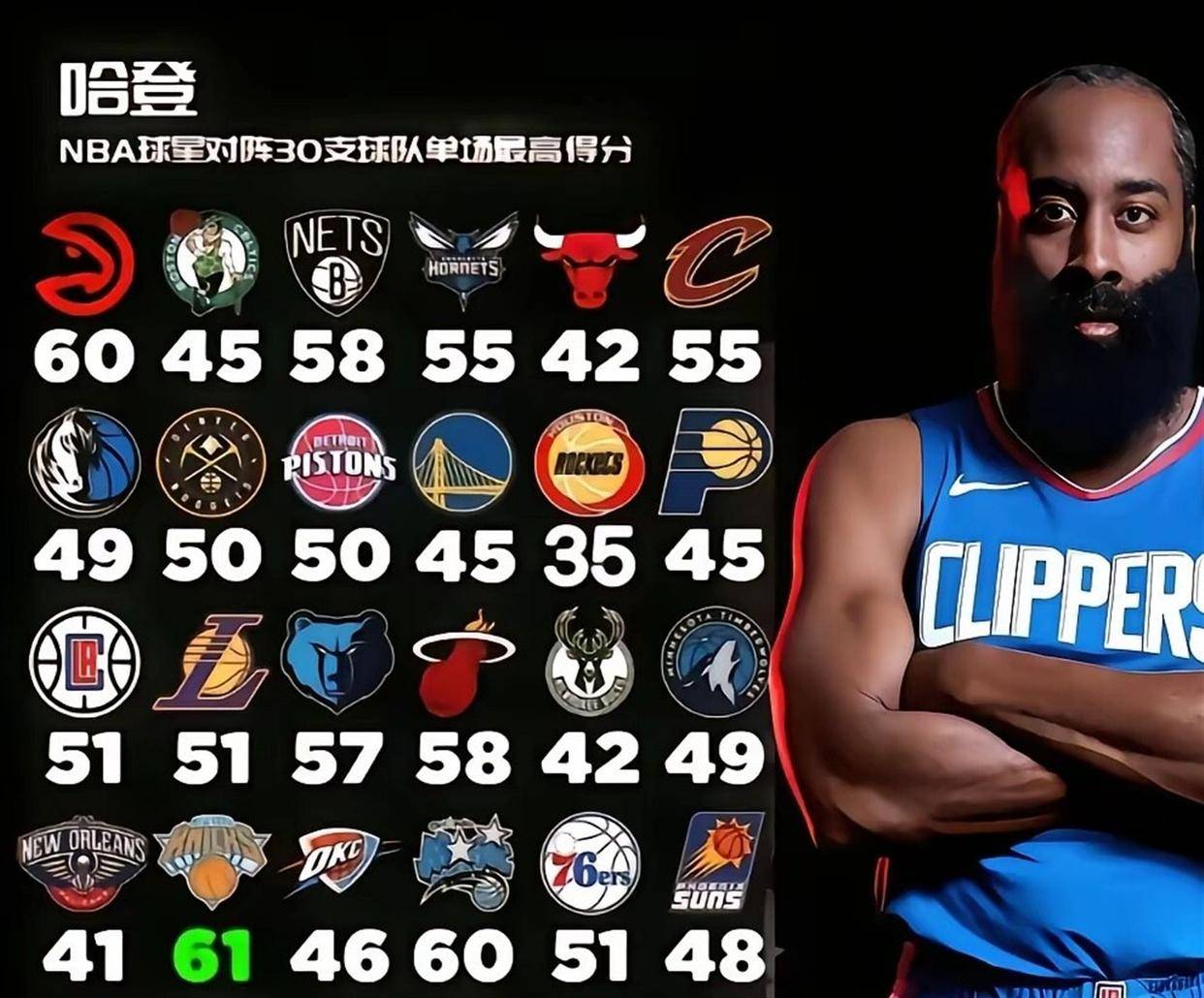 哈登的得分能力到底有多恐怖? 翻翻他对阵全联盟所有球队的单场最高分,数字会告诉你答案。 他不是那种挑软柿子捏的球员,他的高分表演,遍布东西部,不论强弱。